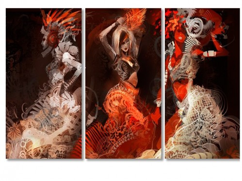 Три графічно намальованих дівчини. Сучасна абстракція. Друк на полотні, в комплекті 3 модуля, загальний габарит 90x60 див.